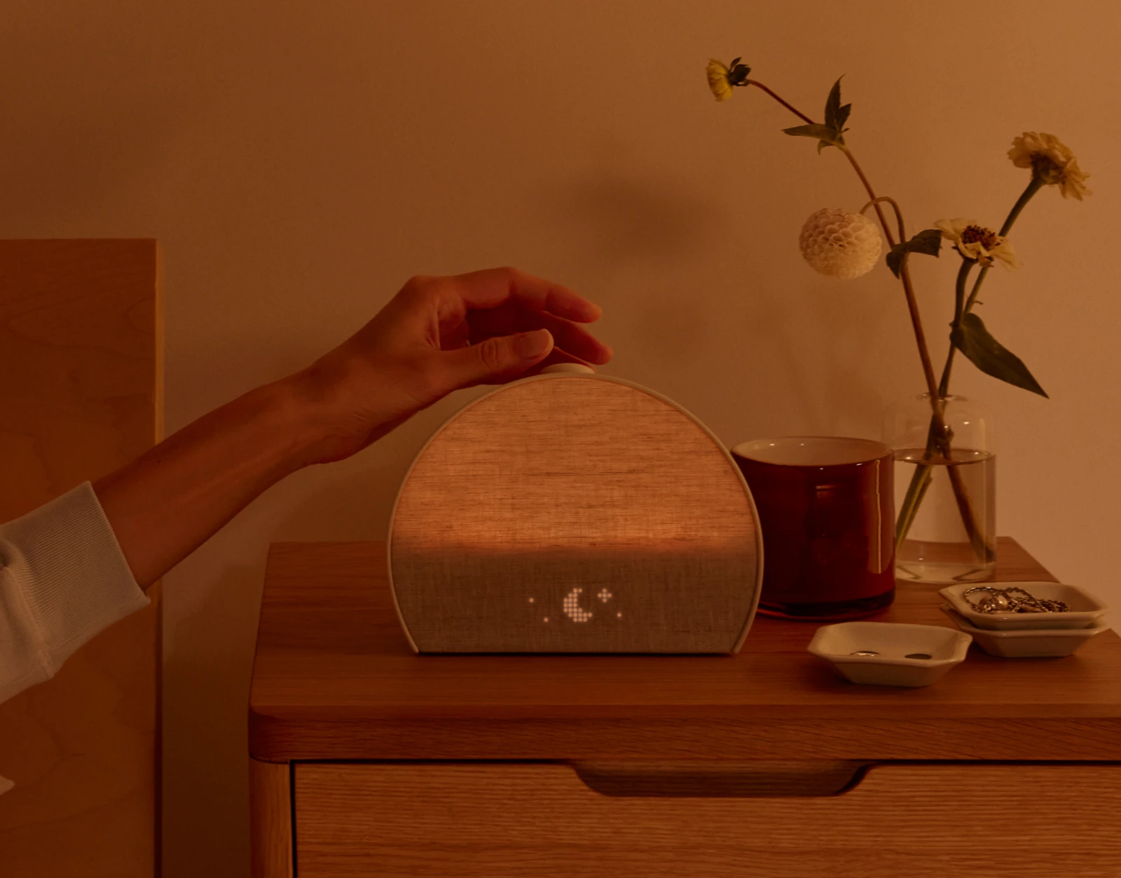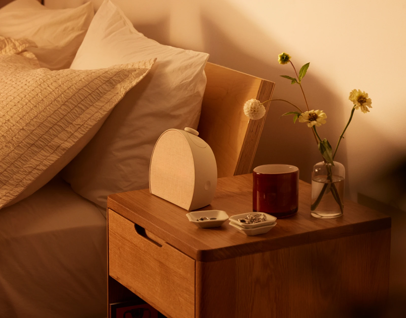 Phone-free sleep routine device positioned around calmer evenings, gentler mornings, and premium bedside design.